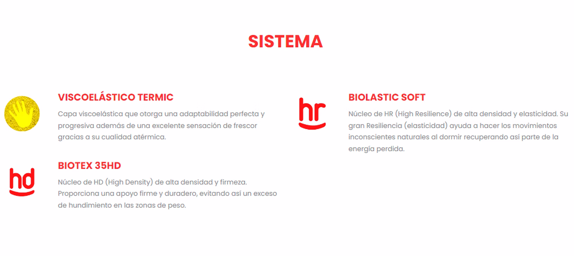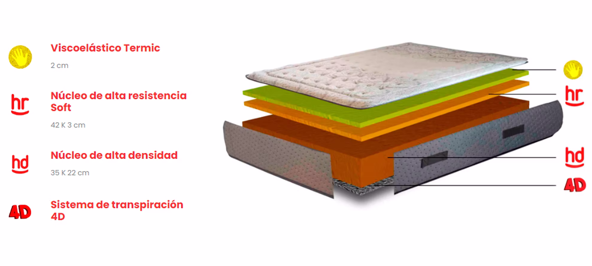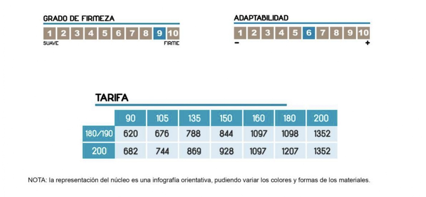 Colchón de alta firmeza y resistencia, de materiales de primera calidad. El núcleo de alta densidad 35k proporciona una alta durabilidad. El viscoelástico termic suaviza el contacto con el cuerpo y aporta un extra de frescor gracias a sus características atérmicas.