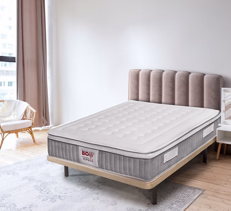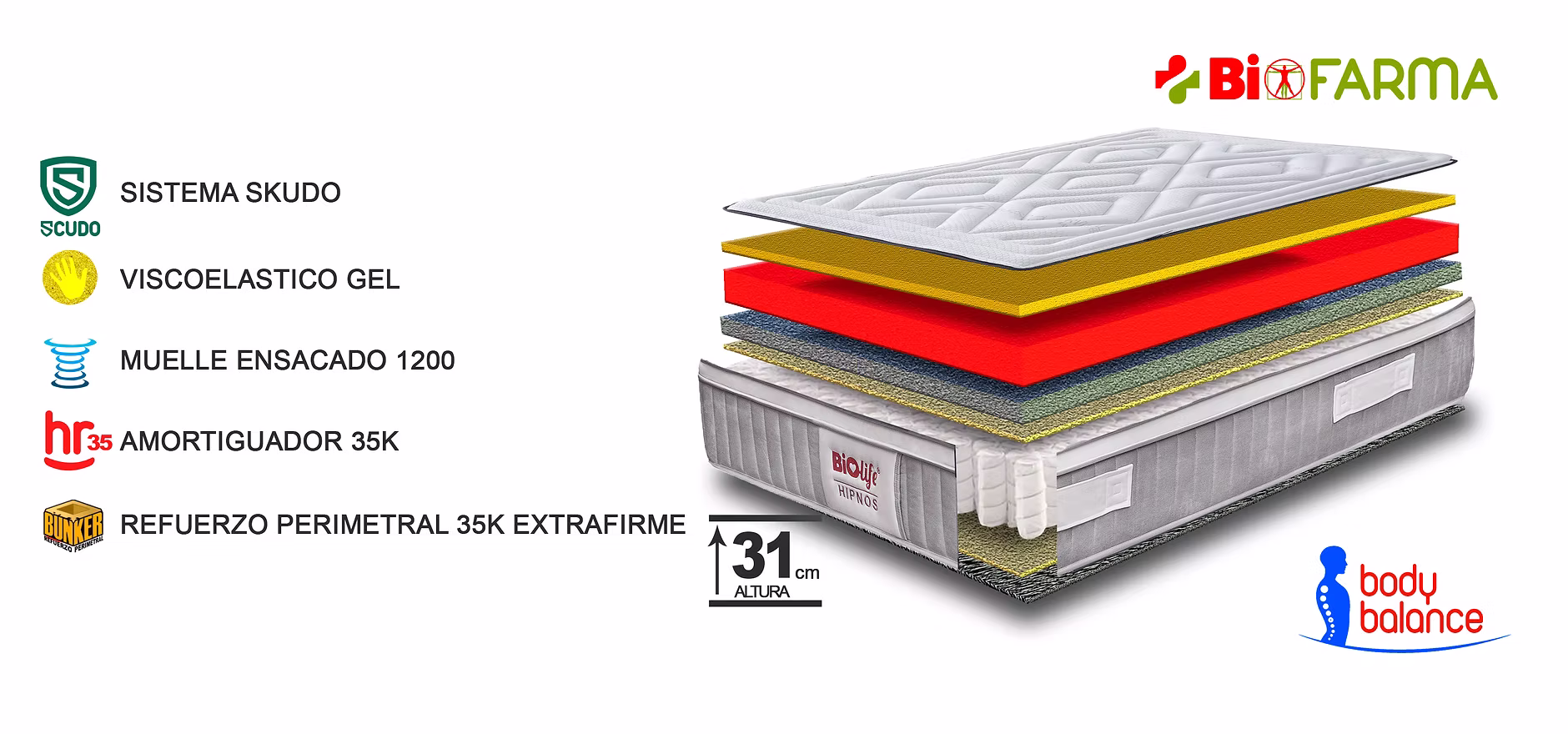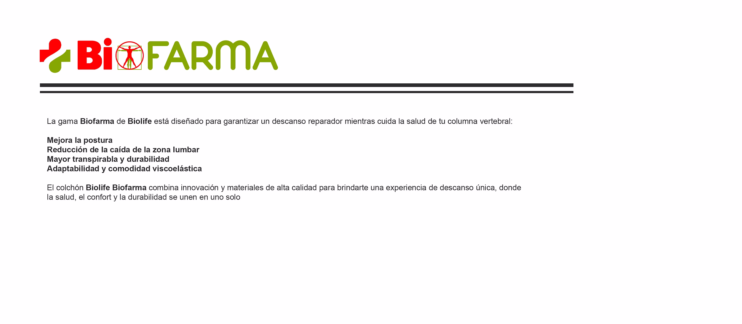 Colchón de la gama Biofarma de Biolife con alto contenido en carbono en los muelles y una amortiguación de alta resiliencia para conseguir un colchón con una firmeza y adaptabilidad ideal a cualquier peso.