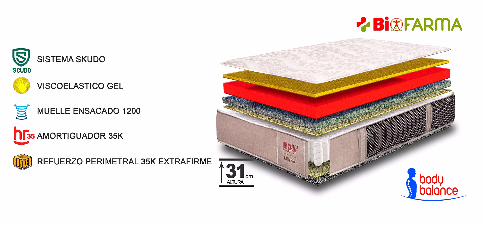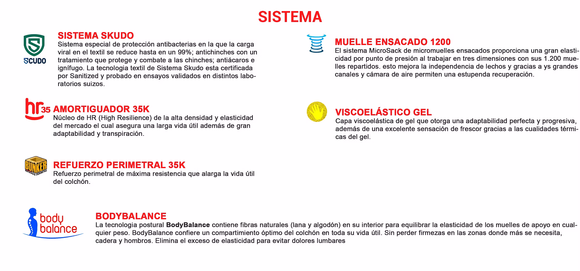 Colchón pensado para la perfecta alineación de la columna. Bloque de alta densidad 35k evita la caída de la cadera. El sistema microsack permite que las zonas pronunciadas del cuerpo sean acogidas suavemente por el colchón, apoyando así el 100% de nuestro cuerpo por igual. Además, aporta una cámara de aire para evitar la retención de humedad.